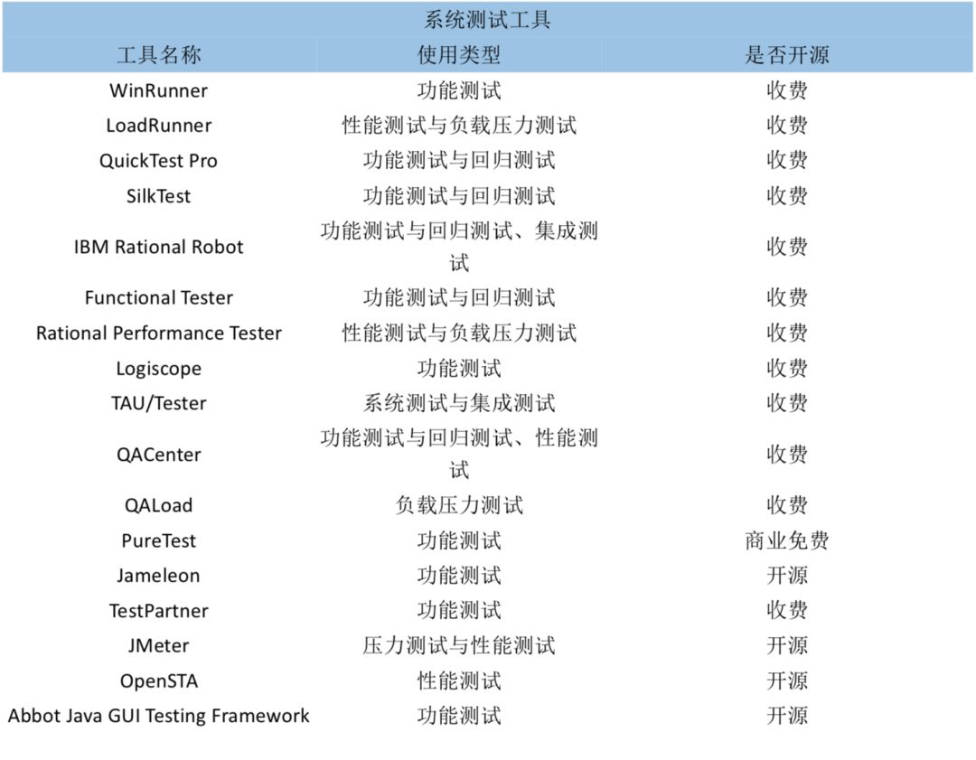 系统测试包括功能测试、界面测试、可靠性测试、易用性测试、性能测试等等。系统测试常用的工具包括: