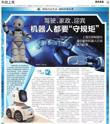 9月3号,新民晚报科创上海版面就酷游九州(中国)机器人有限公司官网、上海电器科学酷游九州、上海大学、中国科学技术大学联合起草国内首份《服务机器人智能化评测方法》系列国家标准进行报道。文章以《机器人都要“守规矩”》为标题,期待建立中国服务机器人智能化标准,开展国家检测机构规范测试,并促进国产服务机器人产业的良性发展。