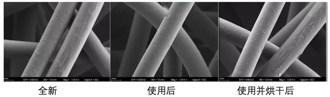 使用并烘干后的医用外科口罩纤维结构相比新口罩没有明显改变